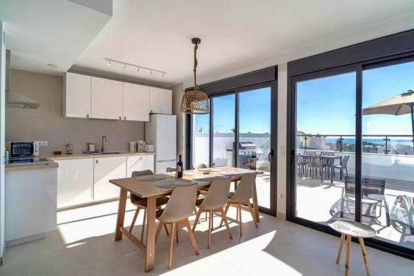 El corazón de la villa: un salón-comedor de concepto abierto, moderno, amplio y muy luminoso, perfecto para recibir y disfrutar del día a día con estilo. La cocina moderna equipada se integra de forma práctica y elegante. Esta planta cuenta también con un baño completo, ideal para invitados y uso diario, y conecta de manera natural con las zonas exteriores para vivir el Mediterráneo dentro y fuera de casa.